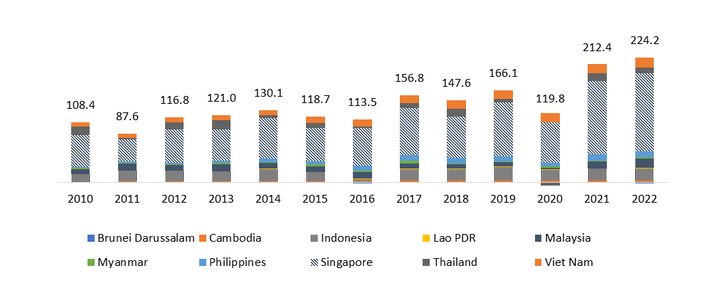 In 2022, Singapore emerged as the largest recipient of FDI within ASEAN, with a total of US$141 billion. However, it is important to note that a substantial portion of investments in the region is directed through regional headquarters and holding companies domiciled in Singapore, which can inflate the apparent FDI inflows. Overall, the FDI inflows are predominantly driven by the growth of the semiconductor and electric vehicle (EV) manufacturing industries, as well as the digital economy.