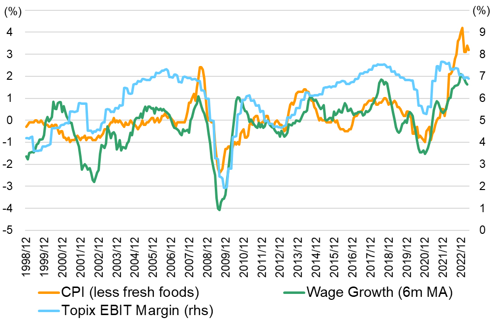 Japan has been plagued by a deflationary cycle since the collapse of the bubble economy at the beginning of the 1990s. A reluctance to raise prices and risk losing market share led companies to instead focus on cutting costs – including wages, R&D and investment – resulting in reduced consumption, underinvestment and lagging productivity. Workers were unable to request wage hikes in an inflation-free environment, and companies kept prices flat. This state of stagnation became the norm for Japanese companies through decades of deflation, with globalisation and a strong JPY piling on further pressure. Companies shifted production overseas and reduced investment at home. Some changes were seen in the Abenomics era of the 2010s, with aggressive monetary policy at the Bank of Japan (BoJ) bolstering the economy; CPI turned positive and corporate profits increased to historic highs, but this failed to translate to higher wages.