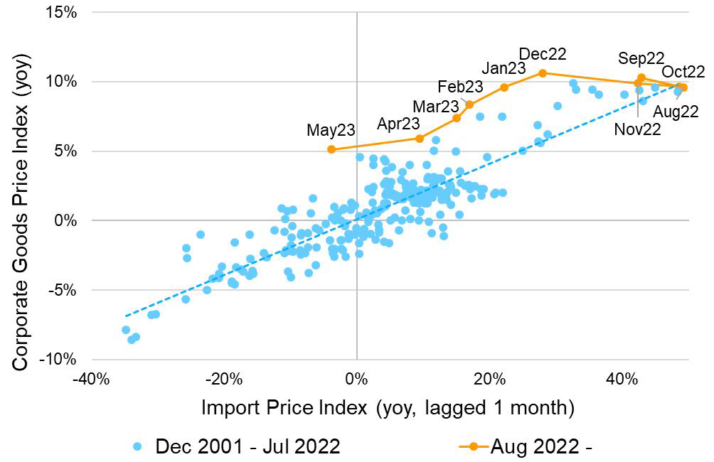 Prices remain sticky in areas but are gradually shifting upwards. Items seeing hikes of 5% or more made up 30% of the CPI basket in April 2023, against only 6% five years ago and 4% another five years before that. Meanwhile, annual wage negotiations in spring 2023 saw management and unions agreeing wage table hikes around 2%, in a first since 1993, after CPI rose 2.2% in 2022. Whether this newly inflationary cycle will be sustained even if CPI growth slows as expected due to declining input prices remains uncertain; deflationary era norms do seem to be changing, however, as evidenced by the continued steady growth of corporate goods prices even following a slowdown in import prices as companies gradually pass on higher costs.