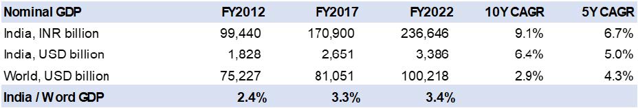 In the last decade (FY2012 to FY2022), India’s nominal GDP grew at a 6.4% Compounded Annual Growth Rate (CAGR) in US Dollar terms (Fig 1) . The headline growth appears subdued, but the period includes the impact of major global events like Covid-19 pandemic, severe supply chain disruption and high commodity inflation. At the country level, the Indian economy also saw disruptions from painful reforms like bankruptcy code, GST implementation and demonetization. Going forward the prospects are much brighter, as evident from the recent IMF update where India is projected to grow at 9% CAGR nominally in US Dollar terms till FY2028. Consequently, India’s contribution of global GDP will rise from 3.4% in FY22 to 4.1% by 2028.