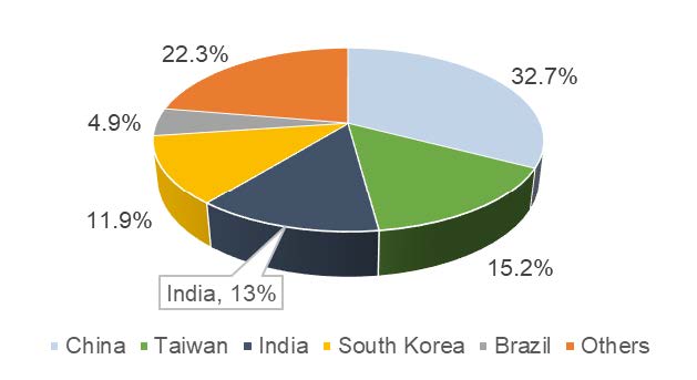 Some long-term investors are drawing parallels between China and North Asia’s historic growth path to India’s future. Currently China (32.7%), Taiwan (15.2%), and South Korea (11.9%) account for 59.8% of the MSCI Emerging Market Index (Fig 2) and arguably India at (13.0%) has much catch up to do, considering its population size of 1.4 billion. While North Asia predominantly grew on exports, India offers opportunity on both domestic and export themes.