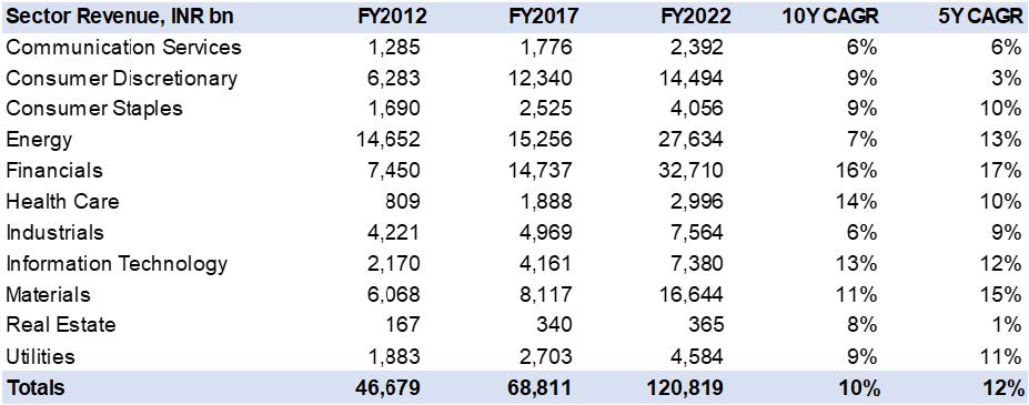 Financial inclusion has been an ongoing key theme as more mid-low-income population got access to banking services, credit facility, insurance, and investment products. This trend is visible in 16% revenue CAGR of BFSI (Banking and Financial Services) companies from FY2012-2022 (Fig 3).