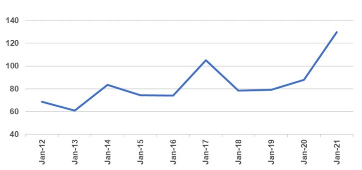An increasing number of companies joined the public market in recent years. At the same time large institutional flows and active participation by the domestic retail investors expanded the market. The number of retail brokerage accounts grew exponentially, from 41 million during pre-pandemic days to 110 million by January 2023. India’s market capitalization to GDP expanded from a mere 68% in Dec-2012 to 129% in Dec-2022 (Fig 4).