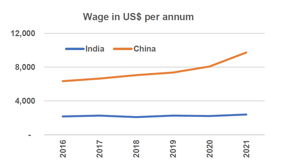With a population of 1.4 billion, India constitutes 17.8% of the world population. In terms of working age population, the proportion is higher at 18.6%. An important and notable point is that in the next 10-years, 400 million people are projected to join the world’s working-age population, of which over 80 million will come from India. Labor cost in India has progressively become relatively cheaper compared to China (Fig 2). This places India in a favorable position for a manufacturing-led growth.