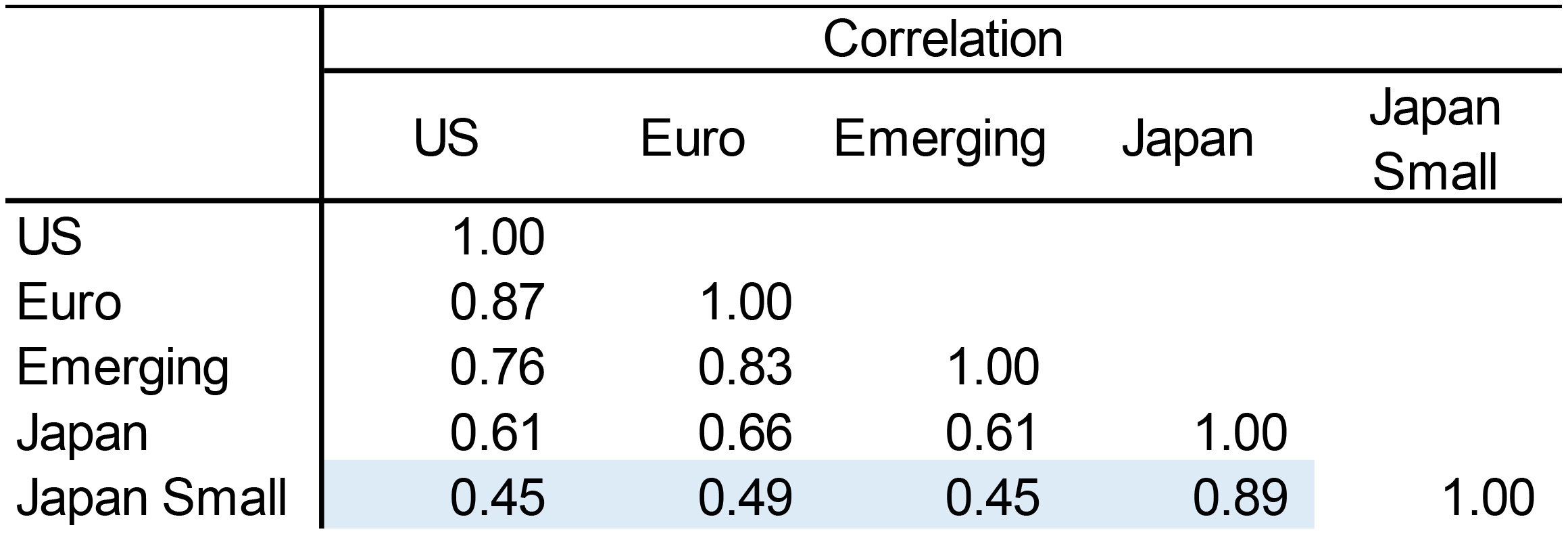 It has often been said that diversification is the only free lunch in investment; and according to Hiro Kasai, Economist at Tokio Marine Asset Management (TMAM), Japanese small caps may be the perfect side dish. Japanese small cap equity, as an asset class, is a good diversification to investors’ portfolios because of its low correlations with other equity markets (Figures 1, 2). This is partly because Japanese small caps are less exposed to global economic cycles than large caps, and partly down to lower ownership by foreign investors.