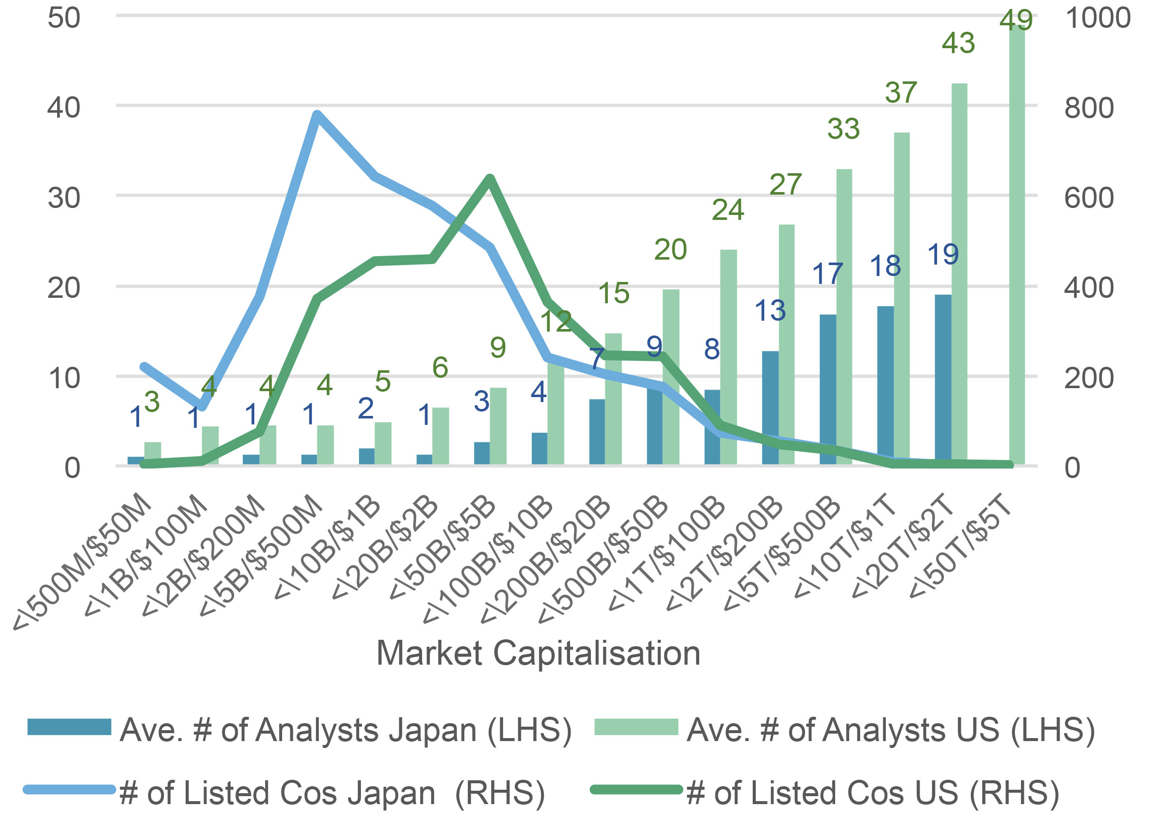 Low sell-side coverage of small caps in Japan is more pronounced than in the US. Japan: Names listed in Tokyo Stock Exchange and JASDAQ, US: Russell 3000 constituents, as at December 2021. Source: Bloomberg