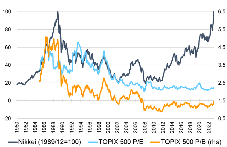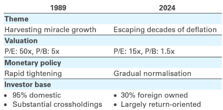 On 22 February 2024, the Nikkei Average recorded an all-time high of 39098.68, 34 years on from its previous peak of 38915.87 on the last trading day of 1989. History does not repeat itself, it has been said, but it often rhymes: stock market growth in 1989 was supported by easy monetary conditions, as is the current rise. Here, the rhyming ends, however. Valuations tell an entirely different story; significant shifts in the investor base have had a marked impact; and the Bank of Japan is following a distinctly different roadmap.