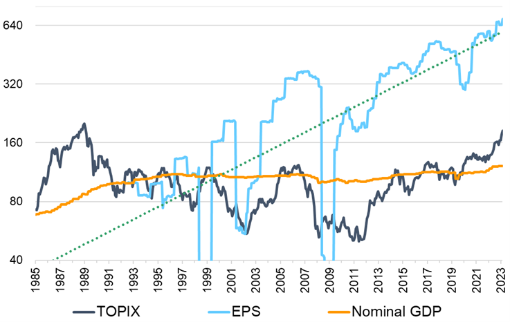 The market’s P/E ratio today is around 15x, compared to a staggering 50x in 1989; P/B is down from 5.0 in 1989 to 1.5. EPS of listed companies has grown at an average pace of around 6.5% p.a. over the past 30 years, much faster than the country’s GDP. This time it’s different: the all-time high stock price is backed by all-time high corporate earnings.