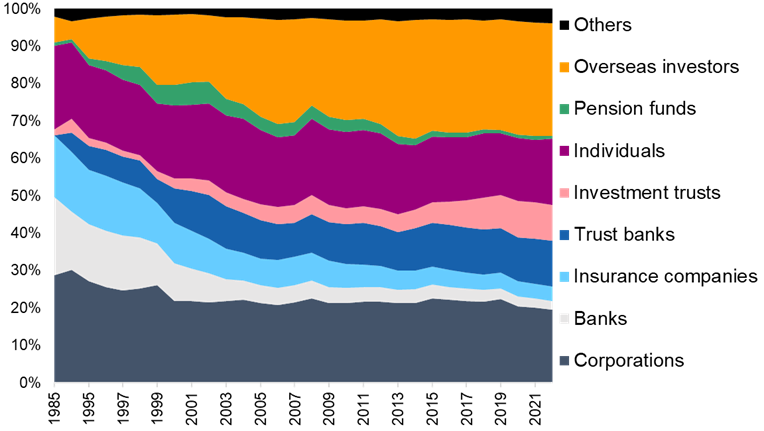Japan’s financial bubble at the end of the 1980s was driven by a feeling that the market was enjoying the harvest of its post-war economic miracle. Asset prices were inflated to a level that the square kilometre on which stands the Imperial Palace in Tokyo was held to be worth more than the US state of California. This was an overwhelmingly domestic bubble, with foreign ownership around just 5% in 1989; overseas investors now hold more than 30% of Japanese equities. Stock prices were inflated by limited supply, as some 40% of shares were held by stable, silent shareholders, with around half estimated to consist of cross-shareholdings – equity held by companies in business partners for the strategic purpose of maintaining those relationships. Financial sectors, including banks and insurance companies, accounted for more than 30% of market capitalisation in 1989, but partly due to the liquidation of cross-shareholding their market weight has been more than halved.