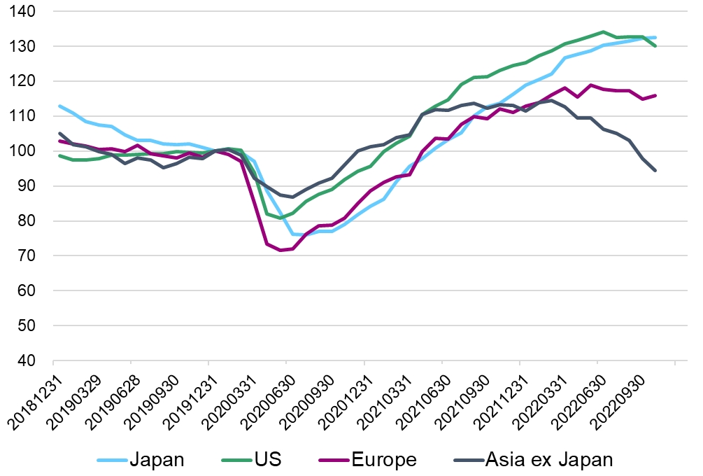 According to Hiro Kasai, Senior Strategist at Tokio Marine Asset Management, the major difference is how the country responded to Covid-19, and the timing of its recovery. Summer 2022 saw Japan's government finally move away from its relatively conservative stance on reopening, with a gradual lifting of restrictions on domestic and international travel. Consumption is expected to increase in the October-December quarter as the government subsidises domestic travel, further boosted by a rapid recovery in tourists from overseas. Elsewhere, the Bank of Japan's business survey indicates that capital expenditure will bounce back at last, although a global slowdown remains a concern.