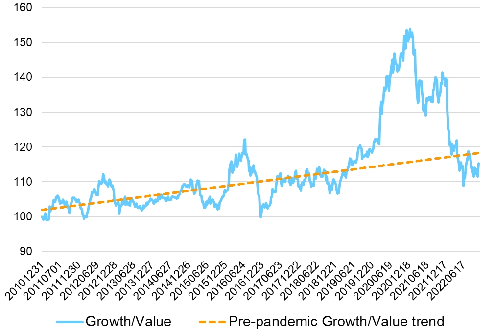The early days of the pandemic saw central banks around the world maintaining easy money stances, fuelling strong outperformance by growth stocks; this has been followed by a rebound in value stocks since the US Federal Reserve called time on easing in 2021. Relative prices have now returned to pre-Covid levels and an end is in sight for the rate hike cycle - good news for growth names, after the value-bias headwind of late.